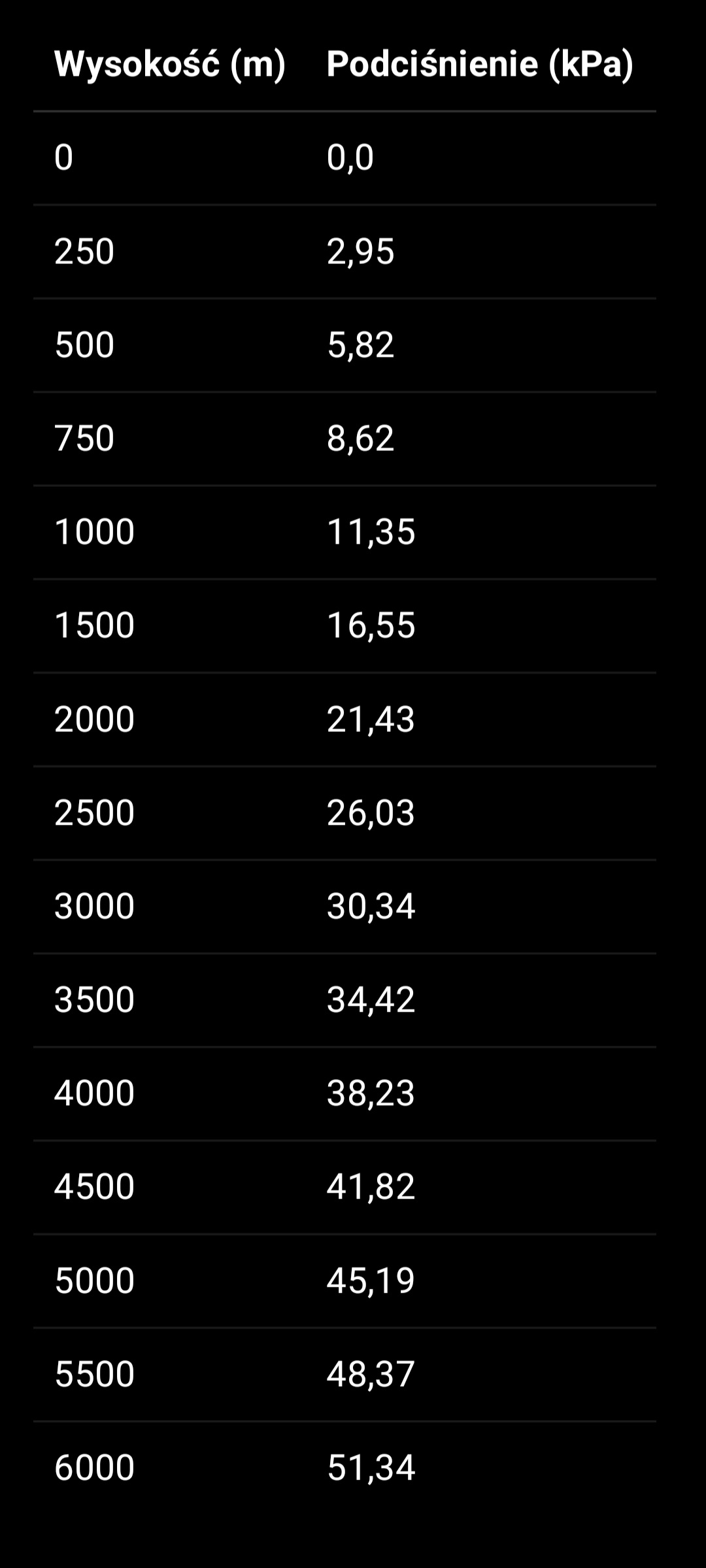 tabela: wysokość (m)→ podciśnienie (kPa).